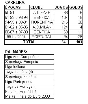 Maio de 2008 - Termina a carreira, obviamente na Luz, diante do Vitória de Setúbal, assumindo as funções de director desportivo do Benfica.
